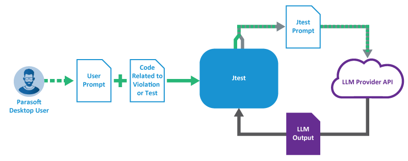 自然言語で質問できるAIアシスタント機能が追加されました。Jtestの利用方法に関する質問を入力すると、製品ドキュメントの内容に基づき大規模言語モデル(LLM)プロバイダーが即座に最適な回答へ導きます。Jtestをはじめて利用する方でも、必要な情報を効率的に取得できるため、製品の習得を円滑に進めることができます。