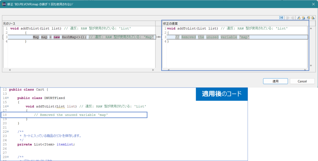 AIが推奨する修正案を、差分エディター上で確認し、直接コードを修正できるようになりました。修正案はエディター上ですべてに適用することも、一部を選択して適用することも可能です。これにより、静的解析の違反修正プロセスを加速することができます。