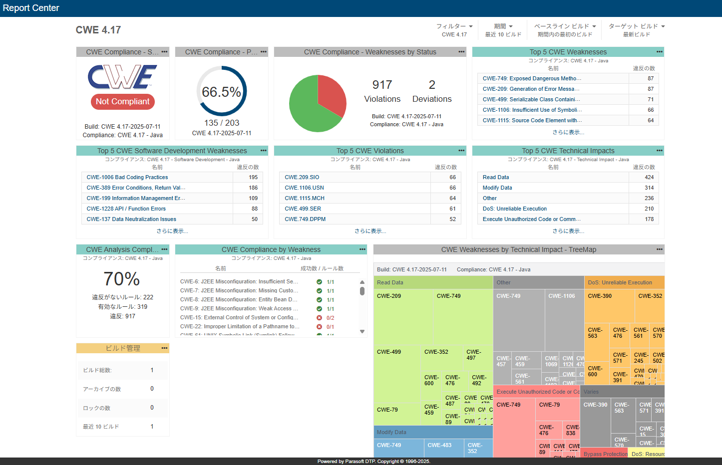 CWE ComplianceアーティファクトでCWE 4.17がサポートされました。Jtestによる静的解析の結果からCWE 4.17やCWE Top 25 2024、OWASP API Security Top 10 2024に則ったレポートをいつでも確認できます。ガイドラインの遵守状況の説明責任を果たすことが容易になるだけでなく、未遵守箇所を早期に特定し必要な措置を講ずることにより、セキュリティ上の欠陥のあるソフトウェアに関連するビジネスリスクを排除することが可能になります。